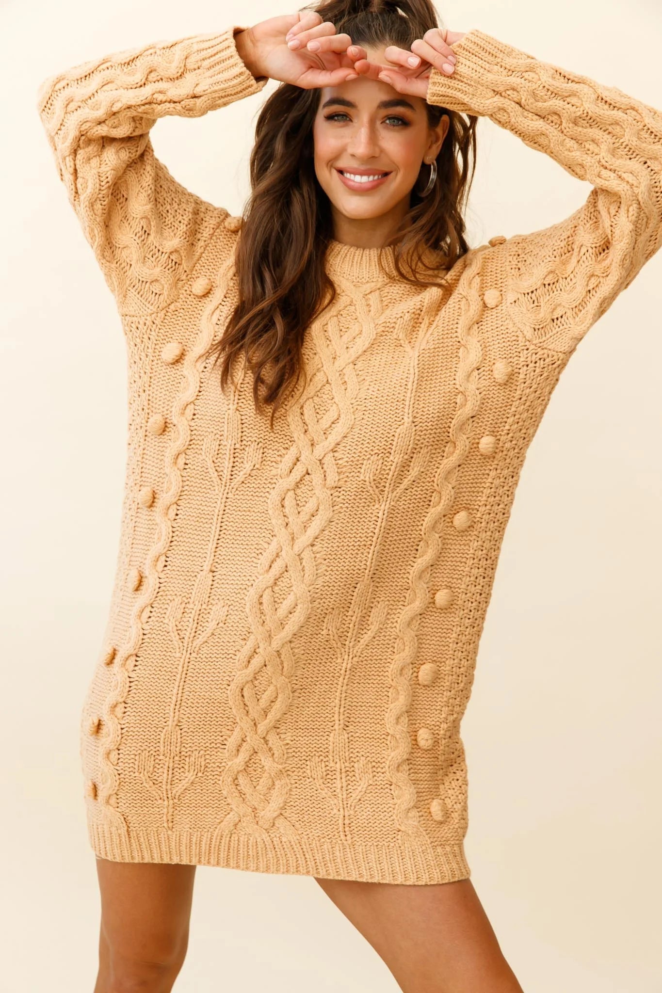You'll look like the dreamiest snow bunny in our cozy Snowstorm sweater dress. We are loving the chunky cable knit and adorable pom pom details. Perfect for cozying up by the fire teamed with tights and over-the-knee boots.