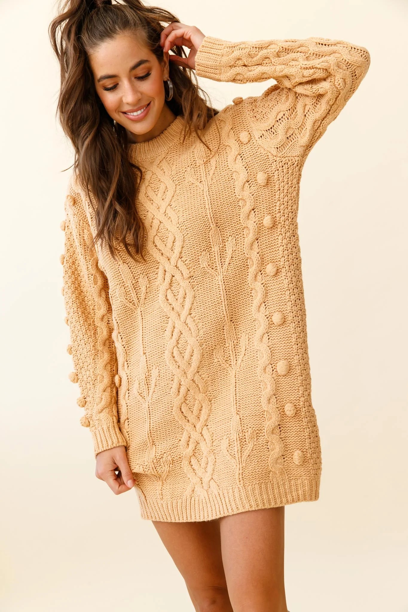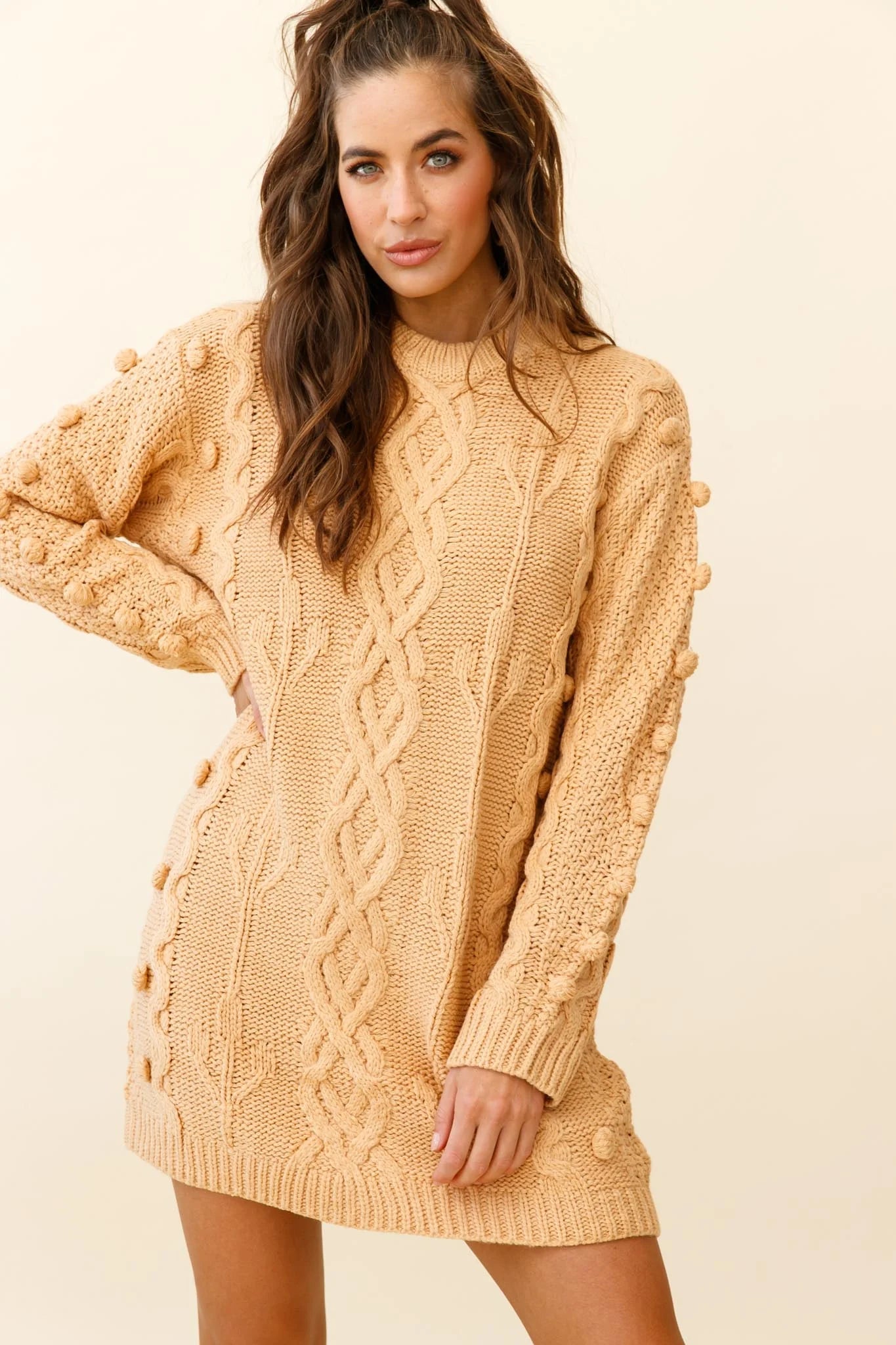 You'll look like the dreamiest snow bunny in our cozy Snowstorm sweater dress. We are loving the chunky cable knit and adorable pom pom details. Perfect for cozying up by the fire teamed with tights and over-the-knee boots.