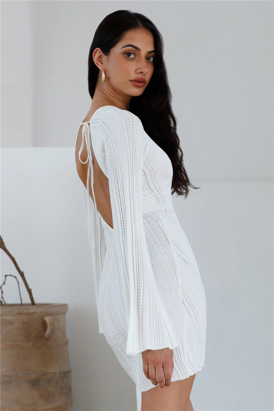 Turn up the charm in the Soulful Nights Long Sleeve Mini Dress White. Crafted in a soft, stretch knit with delicate pointelle detailing, this long sleeve dress hugs in all the right places. A subtle flare at the wrist adds elegance, while the chevron texture draws the eye and elongates the silhouette.