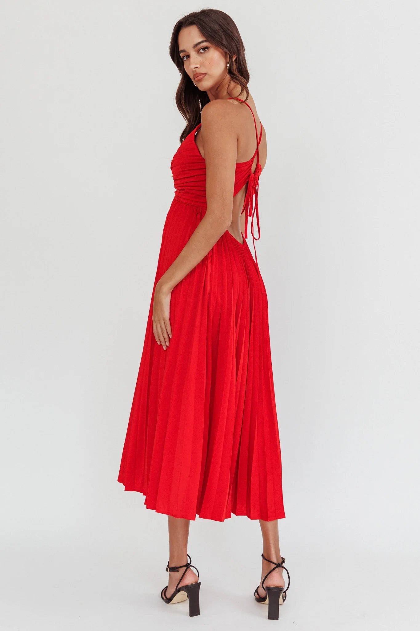 Make a grand entrance in our gorgeous Spoken For midi dress. It features accordion pleat detail throughout and a criss-cross back. Perfect for a wedding or a special celebration. Team it with nude, strappy heels and a clutch for a look that will turn heads.