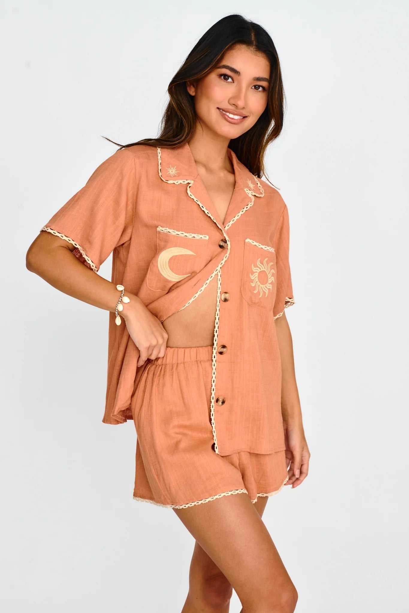 The weekend is calling and you need this shirt. Our Swing Of Things shirt is perfect for coffee dates with your girls or strolling the vintage markets. We are in love with the sweet lace trim and embroidery detail. Team them with their matching shorts and sandals for a casual-chic look we are all about.