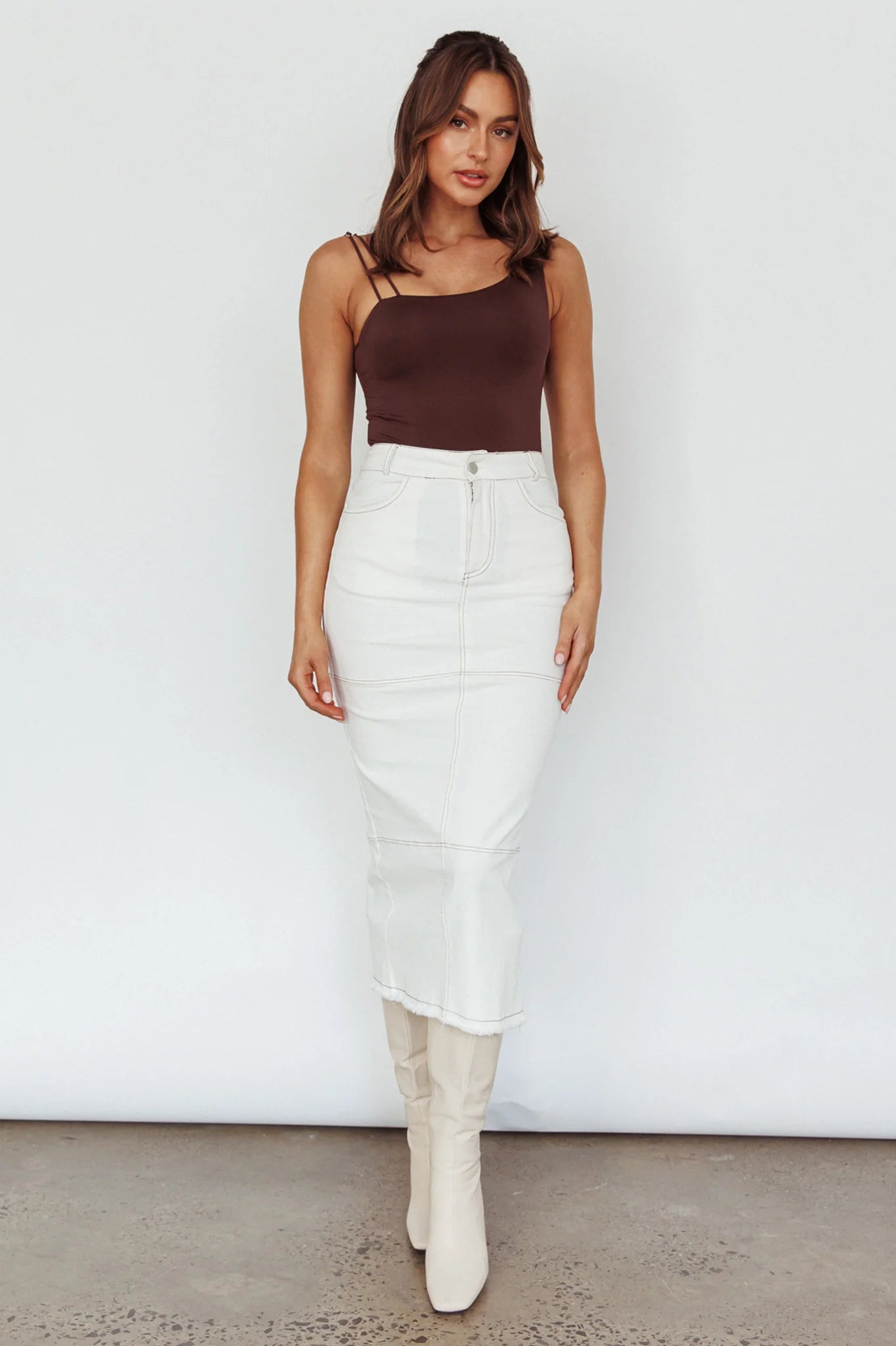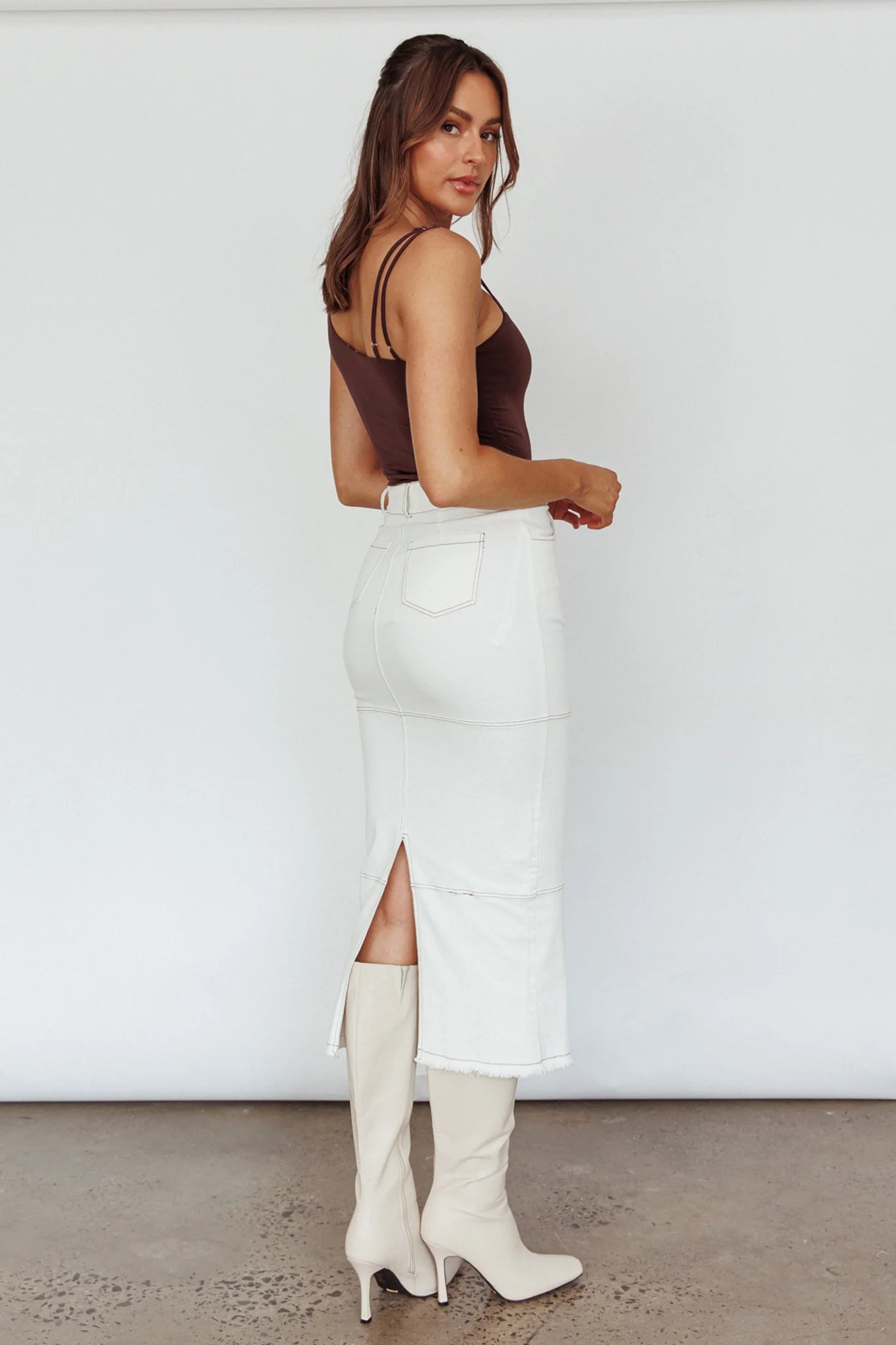 You'll go straight to the best-dressed list in our super cute Thalia midi skirt. We are in love with its on-trend throwback style... and it has pockets! Perfect for going from desk to dinner teamed with a bodysuit and boots.