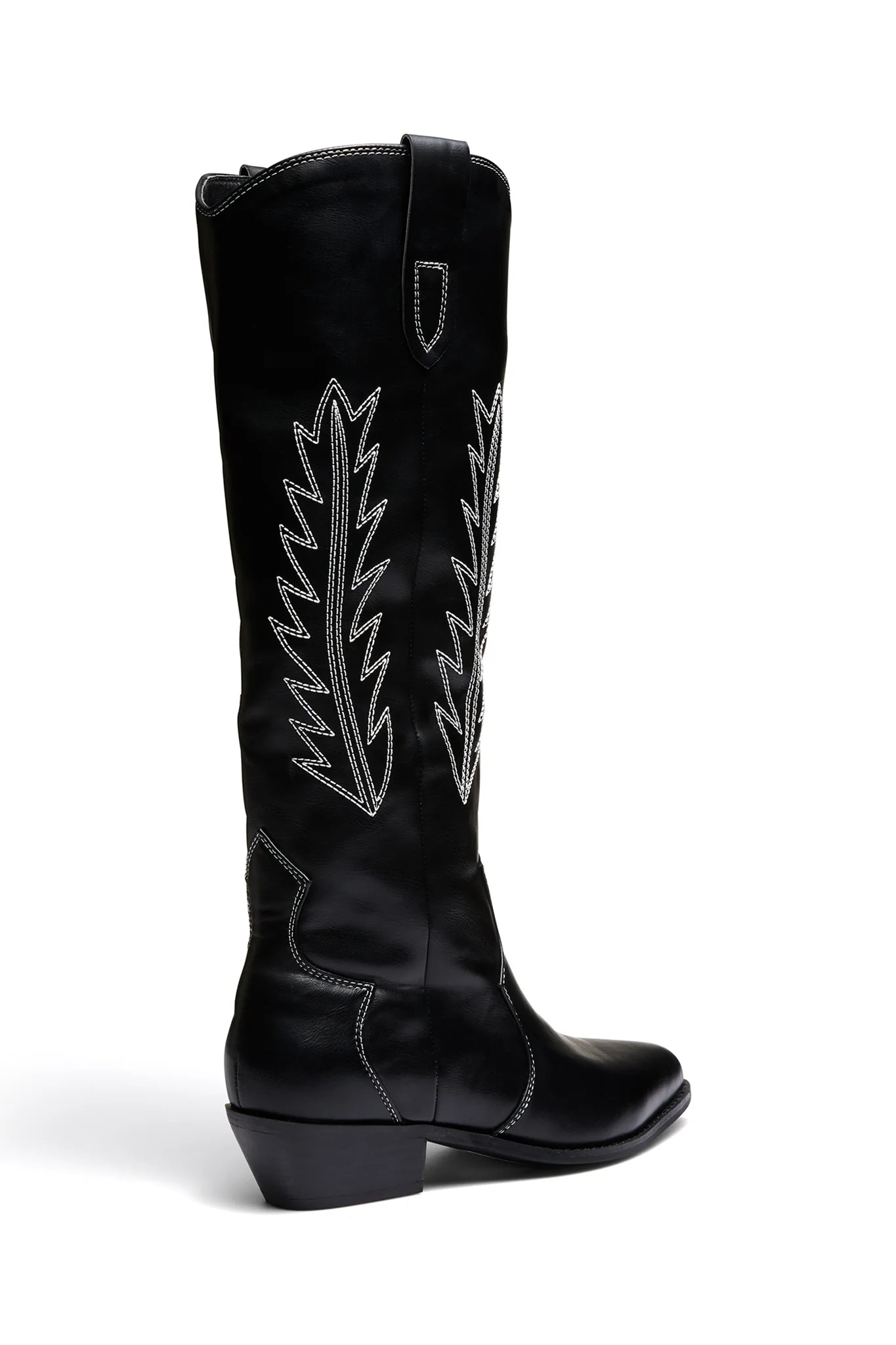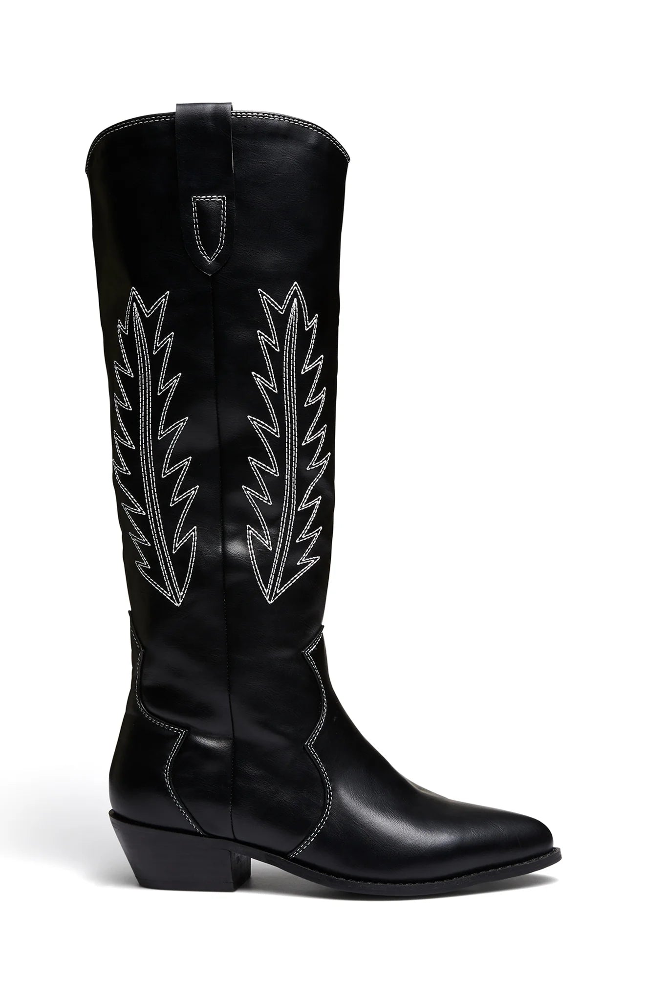 Bonnie by THERAPY - Your favourite tall western style boot will have you covered all year round with her almond toe, western detailing on the upper and low cuban heel. Bonnie with anything from dresses and skirts to denim for those western vibes!