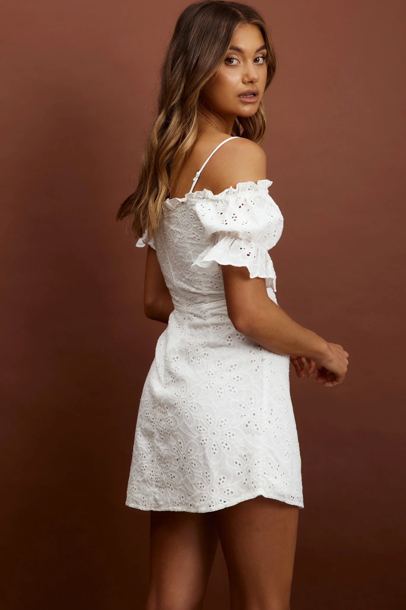 Hey there, cutie! You will be flooded with compliments in our adorable Toluca dress. Featuring an eyelet embroidery fabric throughout and puff sleeves. Perfect for lunch dates with your girls. Team it with tan mules and a tote for a super cute look we are loving.