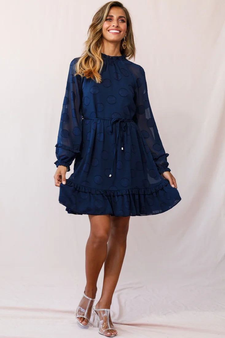 Polka dots galore! This open back dress with sheer overlay on sleeves and back have a sexy, sweet appeal. Pair with high heeled stilettos and a bold red lip. This item runs true to size.