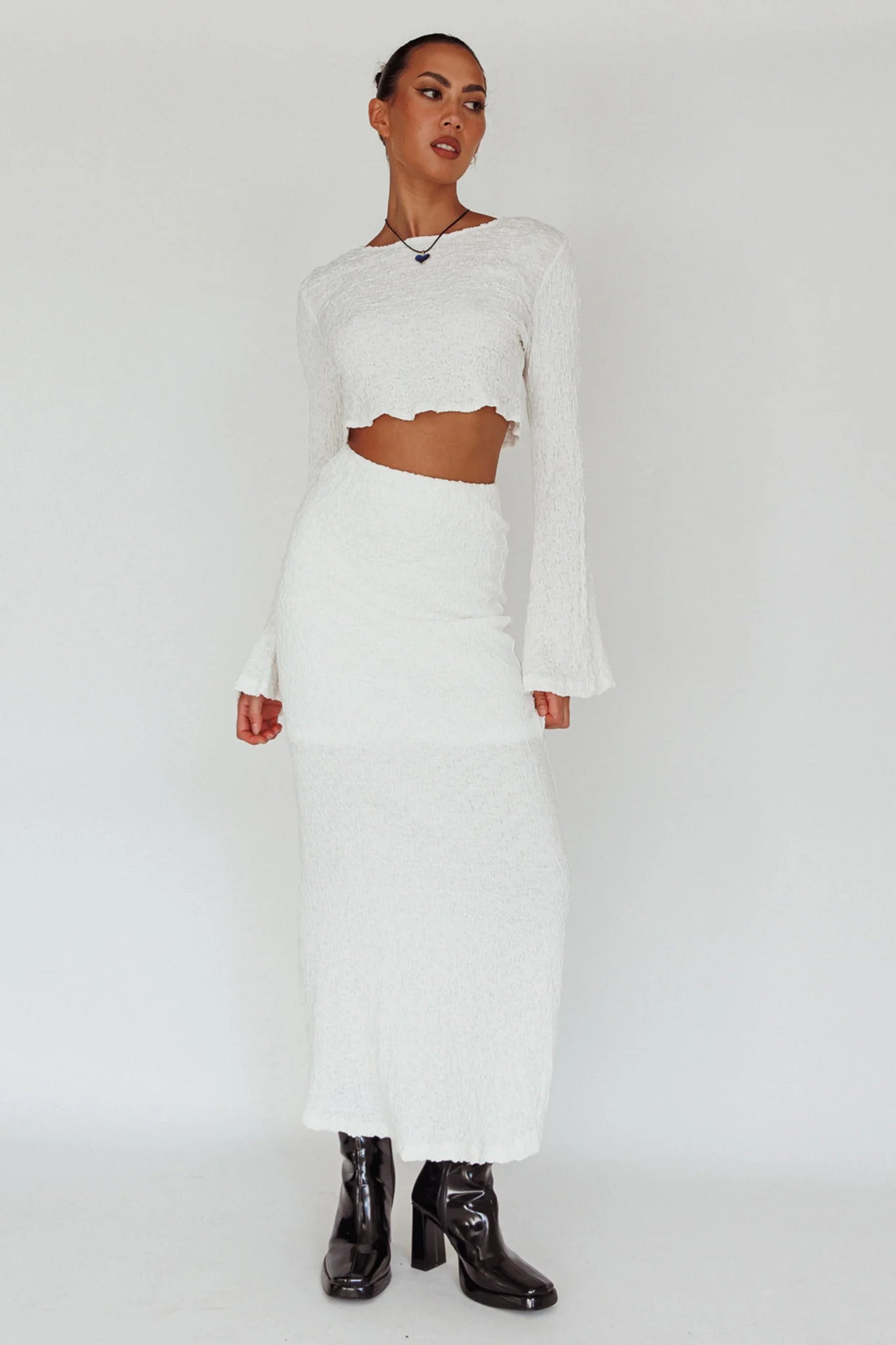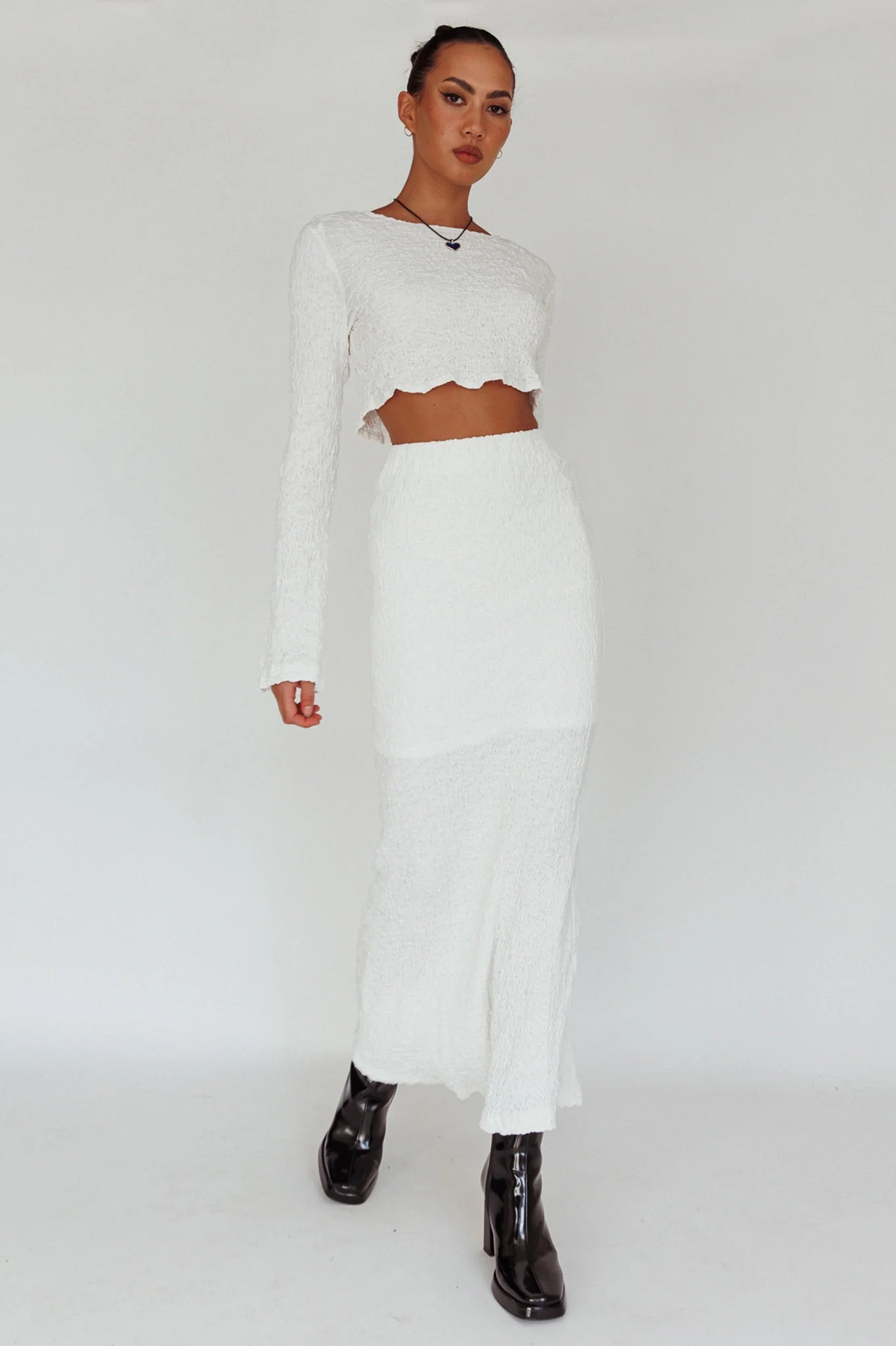 Channel your inner It Girl in our chic Treasures midi skirt. Featuring a textured fabric and elasticated waist. Perfect for a dinner date with your girls! Team it with its matching crop top, mules and a tote for a look that will turn heads.
