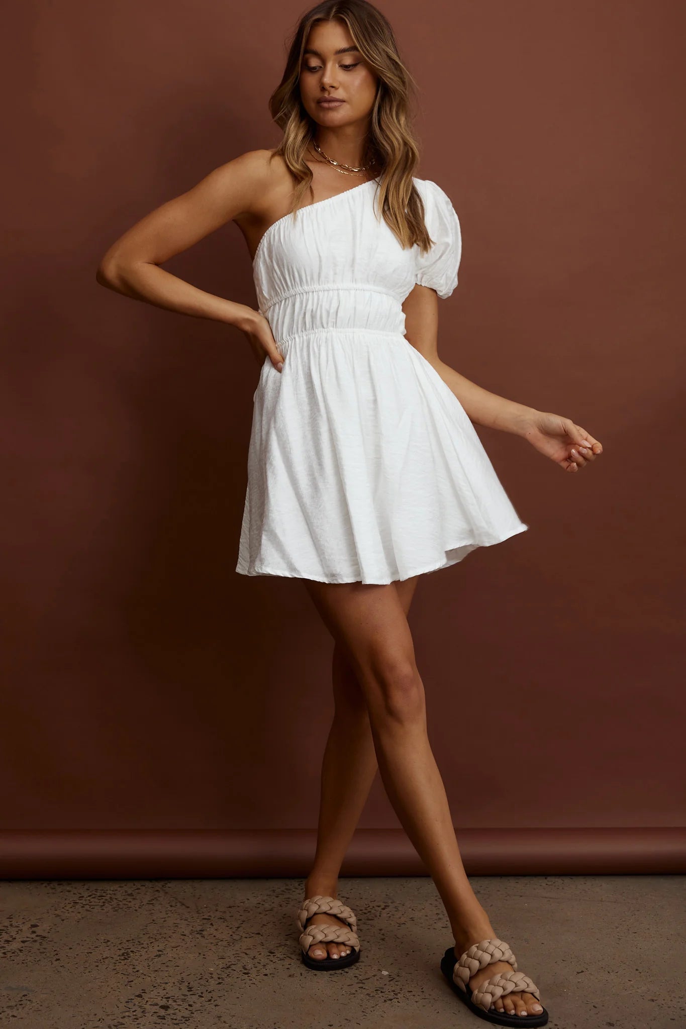 Get up and glow in our super cute True Heart mini dress. Perfect for weekend mimosa brunches with your besties, we are loving the one-shoulder style and drawstring detail in the side! Team it with a straw tote and tan wedges for a look that'll turn heads.