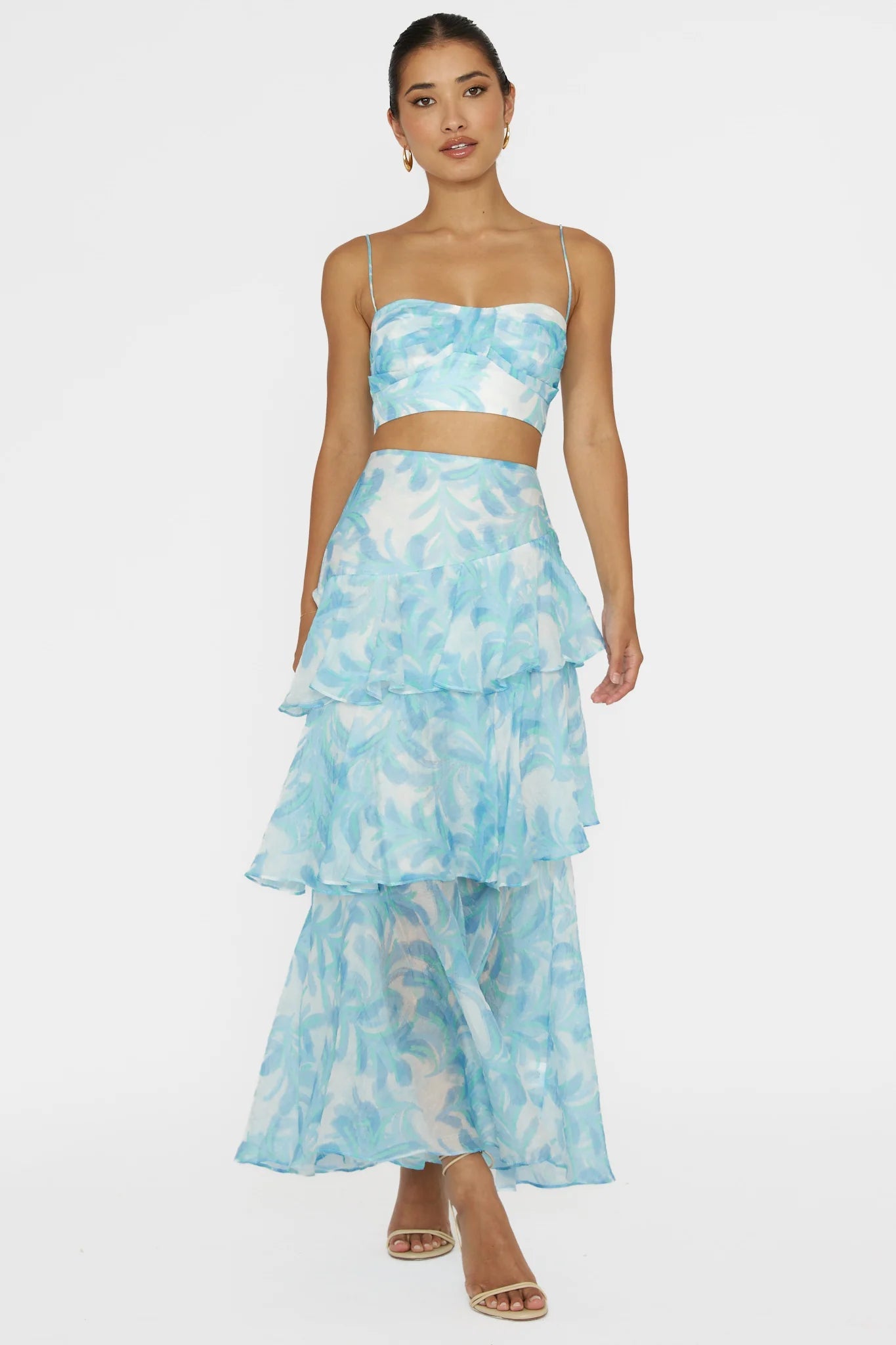 Jaws will drop when you float by in our gorgeous Veda maxi skirt. With its pretty, tiered ruffle detail and floral print fabric, it's fit for a princess. Team it with its matching crop top and strappy heels for an anniversary dinner or special birthday celebration.