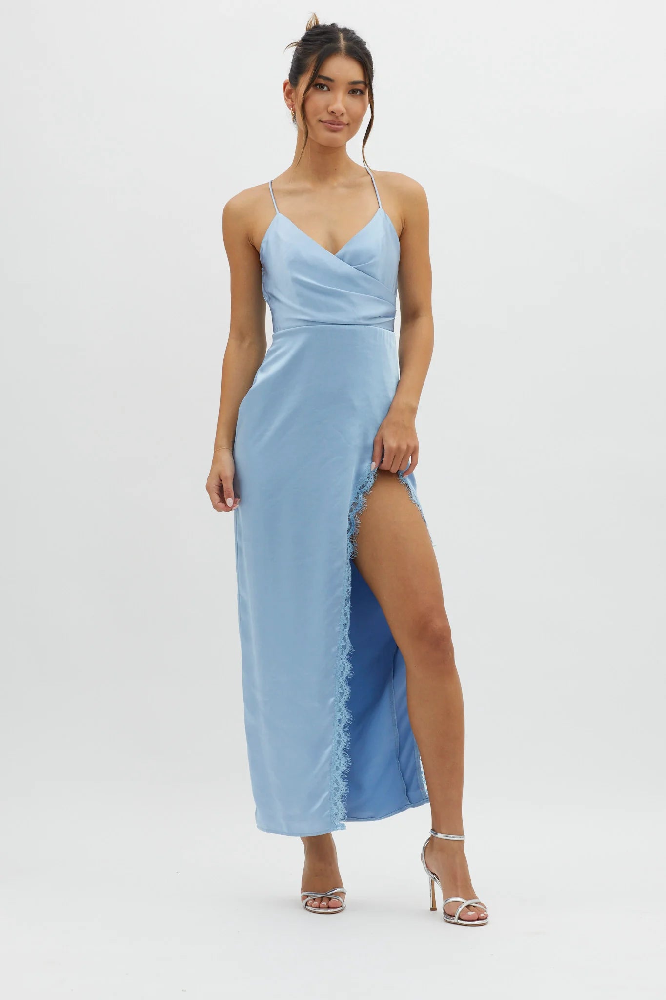 Steal the spotlight in our stunning Winter Moon midi dress. Featuring a split in the front with eyelash lace trim. It's perfect for prom or a special gala event. Team it with silver, strappy heels and a purse for an unforgettable look.