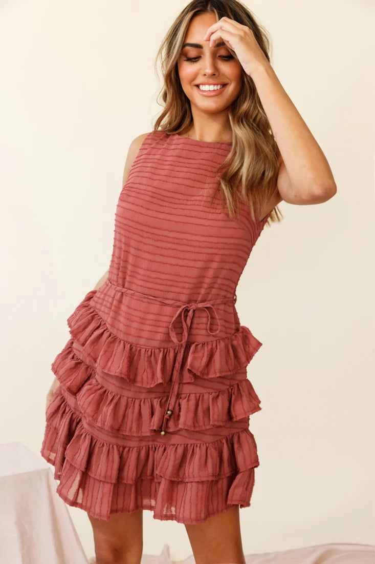Turn heads in our pretty Zayah dress. Featuring a sleeveless design, layered frill skirt and string-tie with goldden toggles around the waist. Perfect for a lunch date teamed with boots and a tote. Super cute!